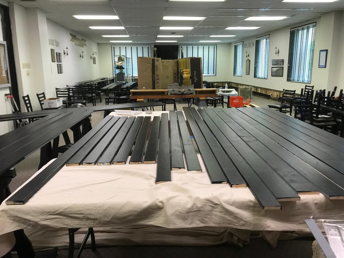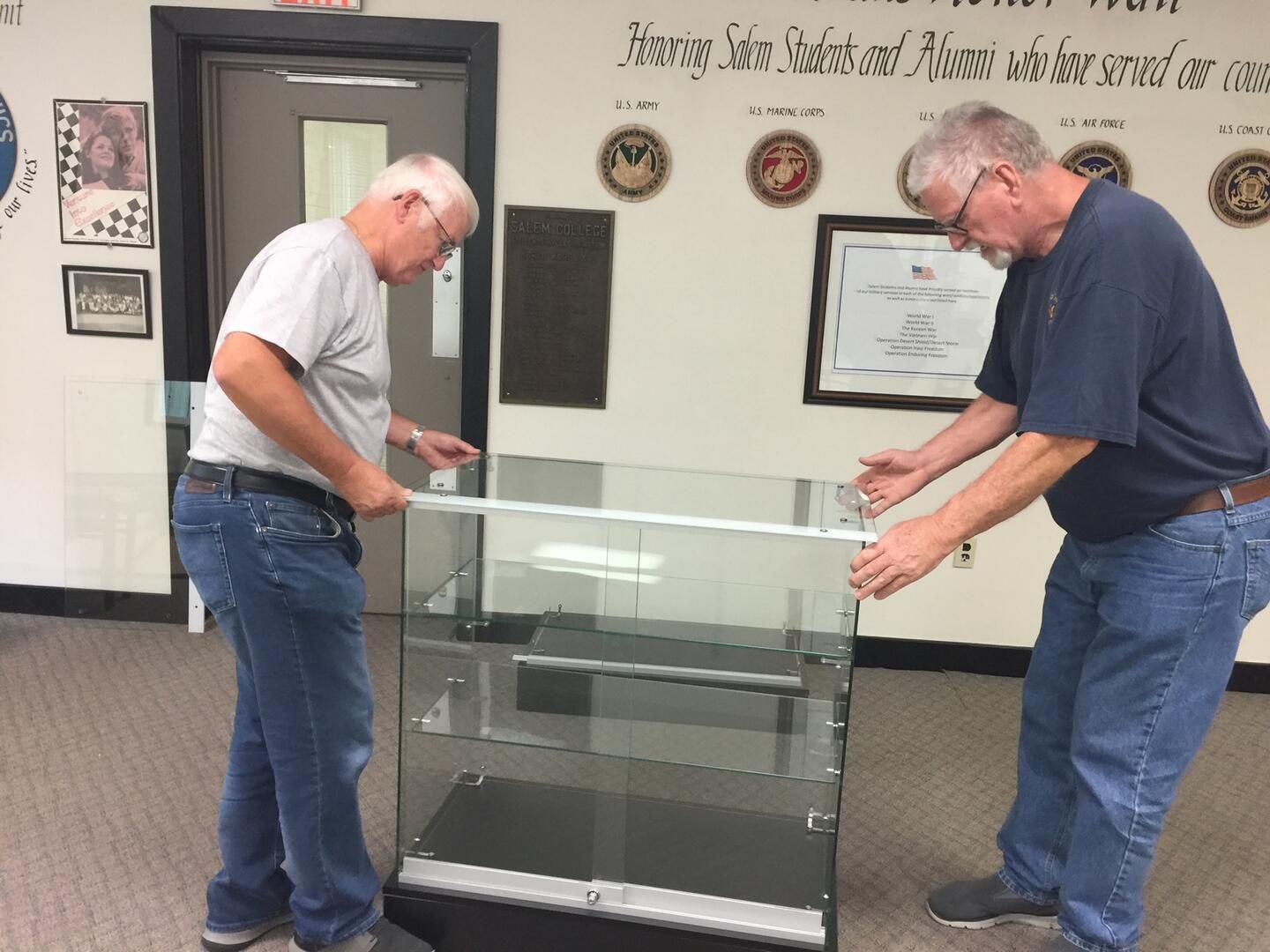 Each wall is labeled and designated for special items. There is the Awards wall which features the names of Alumni who have been selected as Distinguished Alumni and those who have received the Exemplar Award. The next two sections being developed contain the names of Athletic Hall of Fame recipients and will include a Coach's Corner and Alumni being honored for athletic achievements in playing and coaching. The Campus Life wall will be display various forms of life at Salem and will be updated often to include the variety of activities Alumni took part in as students. The Campus Organizations section will feature Clubs and Musical groups. The Greek Life wall will highlight the Social and Service Fraternities and Sororities that were instrumental in the Salem social life. The American Humanic's Foundation wall will give credit to the program that produces many youth organization professionals. The Veteran's Appreciation wall seeks to honor all students and Alumni who served in the Armed Forces, many who were never able to return to classes. A biographical page is being written on each veteran identified and will be displayed in a binder until an electronic display can be created. The hall also displays a 9' tall mural of the Salem College Arch.
